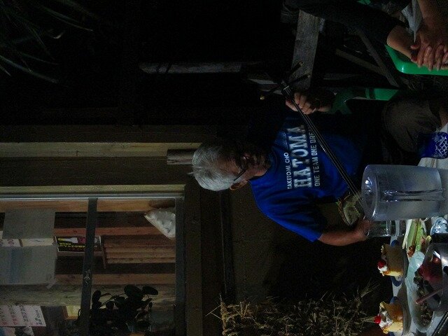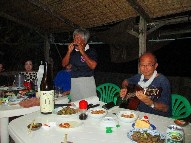 和気あいあいとした宴は続き、我々も演奏を披露したり、よし坊おじいの三線・唄、